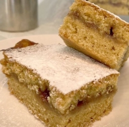 Pecivo pečemo v ogreti pečici 45 minut. Po peki pustimo, da se malce ohladi, nato pa ga s papirjem vred prestavimo na rešetko. Ohlajeno pecivo posipamo s sladkorjem v prahu in ga narežemo na kose.