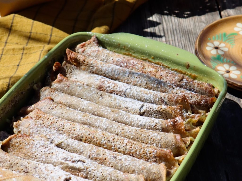 6. Palačinke, pripravljene za peko, prelijemo s tekočo sladko smetano in damo v ogreto pečico za 25–30 minut.