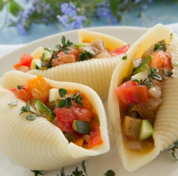 – 300 g testenin (školjkic) – 3 stroki česna – 250 g rumenih češnjevih paradižnikov – 250 g rdečih češnjevih paradižnikov – 1 pest črnih oliv – 1 pest sesekljanega drobnjaka – 1 pest bazilike – četrtina kumare – 4 žlice vinskega kisa – 7 žlic oljčnega olja – sol, poper