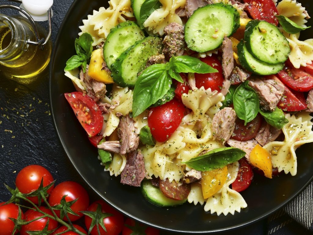– 200 g kratkih testenin – 1 konzerva tunine – tretjina kumare – pol pločevinke sesekljanega paradižnika – sol – poper – 4 jedilne žlice oljčnega olja – 6 žlic majoneze – pol limone – svež peteršilj