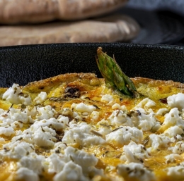 4. Ko se jajca na dnu strdijo, po vrhu fritate položite koščke kozjega sira. Ponvico postavite v pečico in pecite, dokler se jed popolnoma ne strdi, približno 5 do 7 minut.