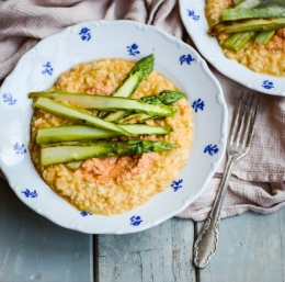 5. Polovico ga nežno vmešajte v rižoto, pol ga naložite na vrh rižote na krožnikih in čez popečene šparglje. Šparglje popecite zadnje in še vroče naložite na rižoto.