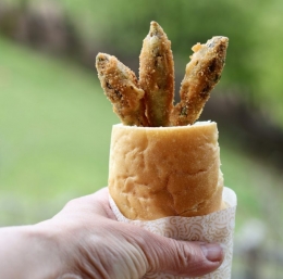 5. Šparglje najprej namočimo v jajčni masi, nato v drobtinah in čim bolj na hitro ocvremo, da postanejo zlato rjave barve.