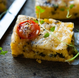 3. Stresemo v pomaščen pekač. Ko se ohladi, narežemo na poljubne kose, jih naložimo v pekač, na vsakega položimo en paradižnik in 10 minut pečemo pri temperaturi 180 stopinj.