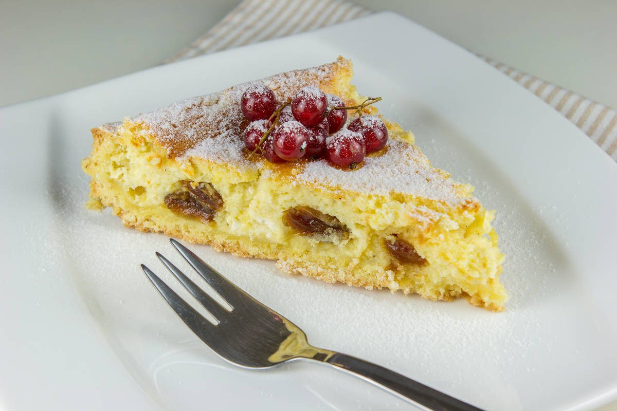 4 kosi Jajce - kokošje 600g Skuta - manj mastna 200g Kisla smetana 200g Sladkor - beli 1 kos Vanilijev sladkor Limonina lupina 50g Jedilni škrob 4 žlice Liker - mandljev 150g Rozine