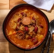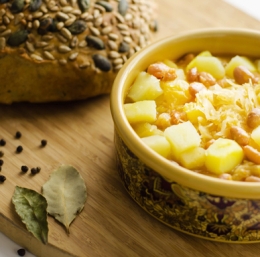 600 g krompirja 500 g kislega zelja ali kisle repe 500 g fižola (8 ur namočenega v vodi in skuhanega ali konzerviranega) 2 stroka česna 1 žlica rastlinskega olja sol in poper 1 lovorjev list po želji še nekaj koščkov veganske šunke ali dimljenega tofuja