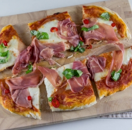 Pizzo vzamemo iz pečice, obložimo z rezinami pršuta in potresemo sesekljan čili in svežo baziliko.