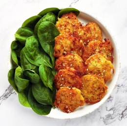 Na srednje močan ogenj postavite ponev. Čebulo na drobno narežite in jo dodajte zmesi na deski skupaj z moko, jajcem in nekaj kapljicami čilijeve omake. Nadrobite fetea sir, dobro premešajte, razdelite na šest delov in iz njih oblikujte okrogle kepice. Na 1 žlici olivnega olja jih na vsaki strani cvrite 5 minut ali dokler se ne zapečejo.
