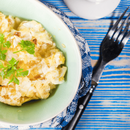 Opomba: Namesto razžvrkljanih jajc lahko na prepraženo čebulo, dodaste jajci in jih zapečete na ”oko” ali pa kot palačinko. Namesto čebule lahko uporabite tudi por, če vam je por boljši ali pa če niste veliki ljubitelji čebule. V razžvrkljani jajci lahko daste tudi malo na drobno narezanega ali pa naribanega sira. Odločitev je povsem vaša.
