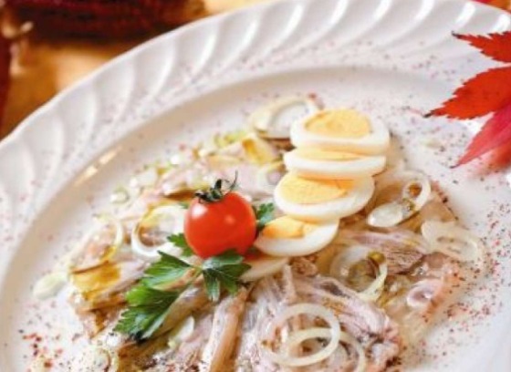 Zrežemo ga na manjše kose in ga damo v primerno posodo. Čez to vlijemo ohlajeno juho, s katere prej poberemo mast. Vse skupaj postavimo na hladen prostor, da se strdi v žolco.