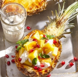3. Z žlico izdolbite ananas, ga narežite na kocke in kocke vrnite v izdolbeno lupino.