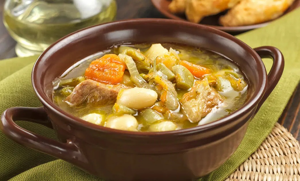 500 g telečjega mesa (npr. pleče) 2 žlici oljčnega olja 1 čebula, sesekljana 2 korenčka, narezana na kolobarje 2 krompirja, narezana na kocke 2 stebli zelene narezane na koščke 2 stroka česna, nasekljana 2 žlici limoninega soka 1 lovorjev list 2 korenini peteršilja oči sol poper 1 l vroče goveje jušne osnove
