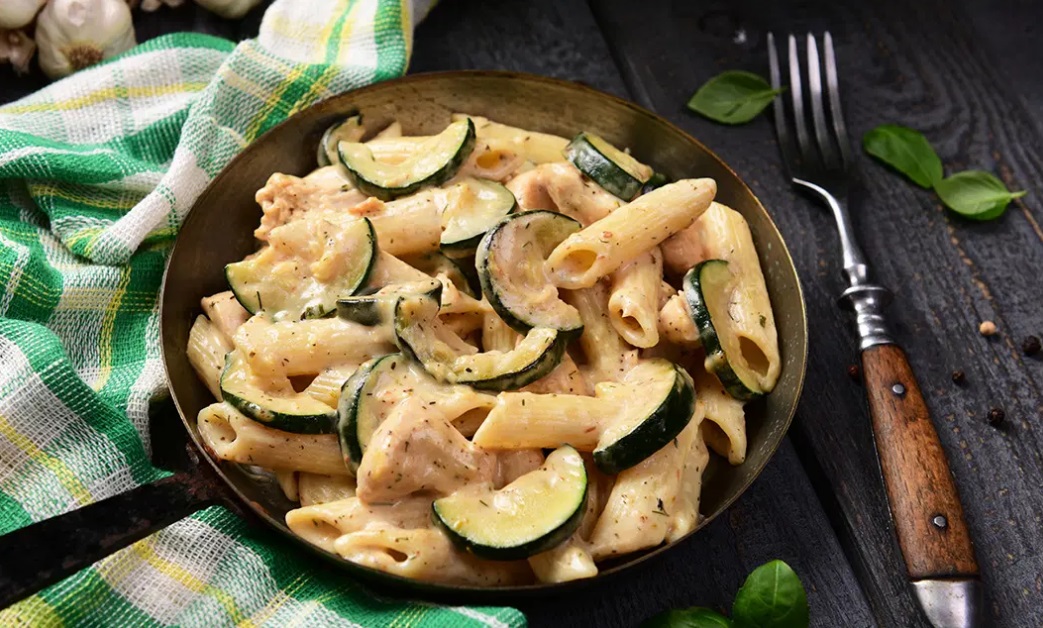 200 g testenin (penne) 1 bučka 150 g piščančjih prsi 200 ml smetane za kuhanje ½ čebule 2 stroka česna sol in poper oljčno olje bazilika parmezan