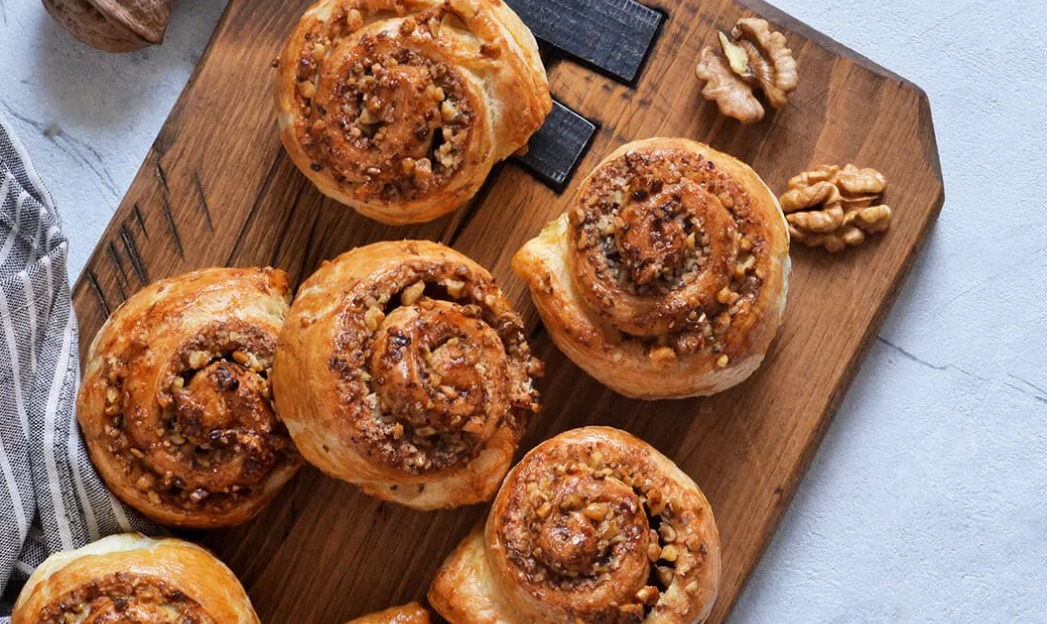 4 Vzhajano testo na rahlo pomokanem prtu razvaljamo na približno 3 mm debelo. Nanj namažemo nadev in testo s pomočjo prta čim bolj tesno zvijemo. Zavitek zrežemo na 1-2 cm velike kolutke, ki jih polagamo na pekač, obložen s peki papirjem. Med njimi pustite dovolj prostora, ker bodo še vzhajali.