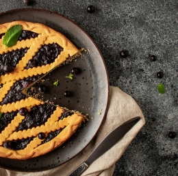 3 Testo razvaljamo v velikost pekača, ki ga prej naoljimo in potresemo z moko ter ga večkrat prebodemo z vilico. Ostanek testa oblikujemo v kepo in ponovno razvaljamo ter odrežemo na trakove, ki jih položimo po vrhu pite.