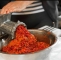 Tradicionalno mletje paprik 2 Na vročem olju prepražimo drobno sesekljano čebulo, da se zmehča. Preden se prepraži do konca, ji primešamo strt česen, še malo popražimo in odstavimo. Dodamo mlete paprike in jajčevce ter premešamo.