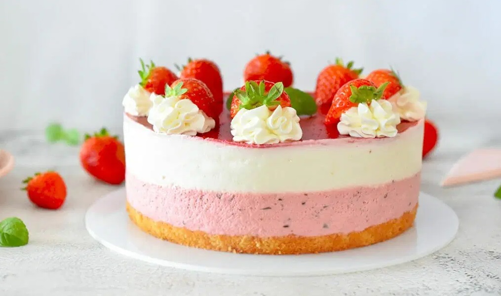 Jagodna torta z meto, grškim jogurtom in bezgom je lepa na pogled in odličnega okusa