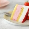 Spodnjo plast biskvita postavimo na podstavek, ga navlažimo in namestimo obroč z acetatno folijo. Premažemo ga z jagodno kremo in površino poravnamo. Drugo plast biskvita obrežemo na premer 16 cm oz. 4 cm manj od premera torte. Položimo ga na sredino kreme, z rokami nežno potisnemo ob kremo in ga navlažimo.