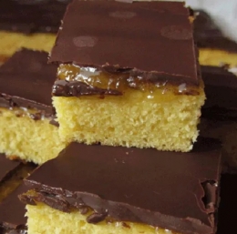 2 Še vroč biskvit premažite z marmelado. Za konec nad vodno kopeljo stopite čokolado in kokosovo maslo, dobro premešajte in prelijte prek ohlajenega biskvita. Sladico postavite v hladilnik, da se čokolada strdi.
