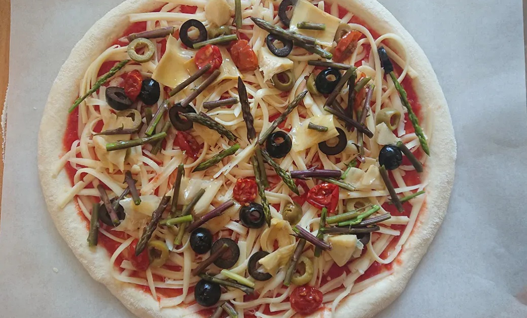 Testo raztegnemo z rokami in pustimo malo roba. Oljke in artičoke narežemo in šparglje nalomimo na koščke. Paradižnikovo omako namažemo na testo, potresemo z origanom in naribanim sirom. Po siru potresemo še vse ostale sestavine za nadev, razen sira brie. Količino sestavin za nadev prilagajamo glede na to, kako obloženo pizzo imamo radi.