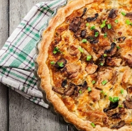 4 Pomokamo pult oziroma mizo in razvaljamo testo. Debelo naj bo približno pol centimetra. Model za pito namažemo z maslom in ga pomokamo. V model položimo testo, ki lahko malce gleda čez rob, in ga nato odrežemo, da je rob enakomeren. Z vilicami testo gosto prepikamo. Na testo vlijemo jajčno mešanico in posujemo gobe. (Česen odstranimo).