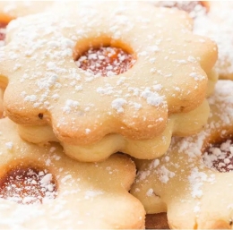 3 Pečemo jih sedem minut pri 220° C. Ko so piškoti hladni, premažemo tiste brez luknjic z marmelado in jih stisnemo skupaj s tistimi z luknjico. Potresemo jih lahko s sladkorjem v prahu.