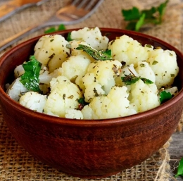 3 Soparimo približno 15 minut, čas je odvisen od velikosti koščkov in želene mehkosti cvetače. Ko je cvetača za naš okus dovolj mehka, jo pretresemo v skledo in ohladimo. Začinimo s soljo, poprom, kisom in oljčnim oljem ter potresemo s svežim nasekljanim peteršiljem.