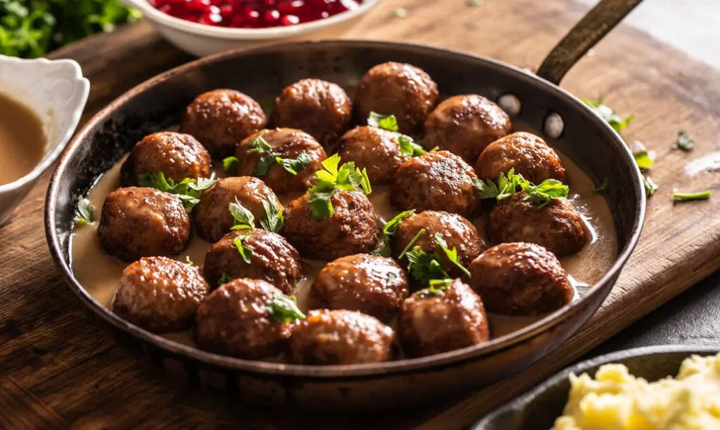6 V omako vrnemo mesne kroglice in jih skupaj z omako kuhamo še 5 minut. Končano jed po želji potresemo s svežim nasekljanim peteršiljem in zraven ponudimo brusnično omako, če nam je všeč.