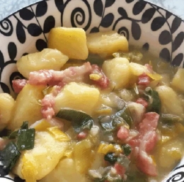 500 g krompirja 250 g pora 1 čebula 120 g mesnate slanine 30 g moke 60 g masla sol poper mlet muškatni orešček 1,5 dl mleka 1,5 dl jušne osnove