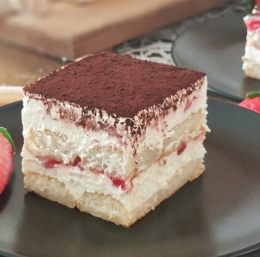 7 Dobro ohlajen tiramisu narežemo na kocke in poljubno dekoriramo.