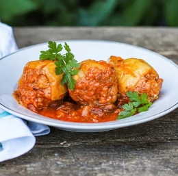 3 Napolnjene paprike previdno zložimo v posodo z omako in zalijemo z jušno osnovo, paprike morajo biti pokrite. Če nam ostane nadev, iz njega oblikujemo kroglice in damo v lonec s paprikami. Kuhamo približno 1 uro in jih pustimo malo počivati. Paprike so še boljše, ko so naslednji dan pogrete. Postrežemo s pire krompirjem.
