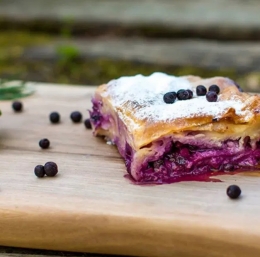 3 Po čisti delovni površini razgrnemo prt in ga rahlo pomokamo. Nanj položimo listnato testo. Na spodnji konec naložimo skutni nadev in ga razmažemo po spodnjih dveh tretjinah testa. Po nadevu čimbolj enakomerno potrosimo borovnice, ki jih nato pokapamo s prepraženimi drobtinami. Stranska konca testa zapognemo čez nadev, potem pa testo po daljši stranici s pomočjo prta zvijemo v zavitek, ki ga položimo v pekač, obložen s papirjem za peko.