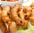 Vsako banano, polnjeno s čokolado, posebej zavijemo v trakove iz testa.