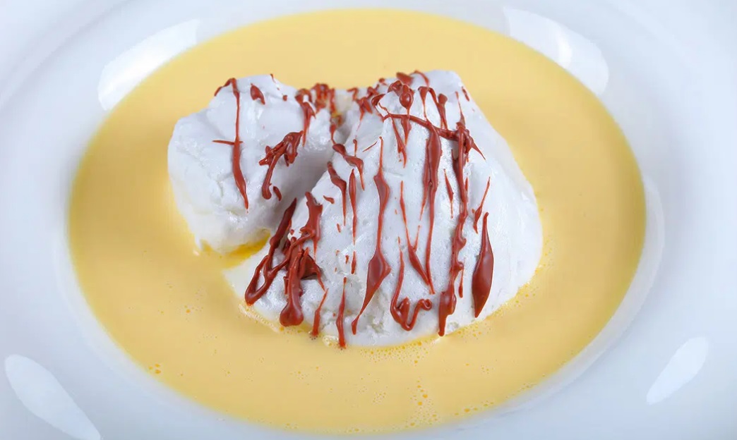 Pripravimo si večjo posodo ali kar v umivalnik nalijemo mrzlo vodo. Vaniljev strok odstranimo. Kuhano kremo položimo v hladno kopel in ves čas mešamo, da se malo ohladi. Kremo polijemo okoli naših snežnih kep. Preden postrežemo, dobro ohladimo. Sladica bo še boljša, če jo okrasimo s stopljeno čokolado ali karamelno omako.