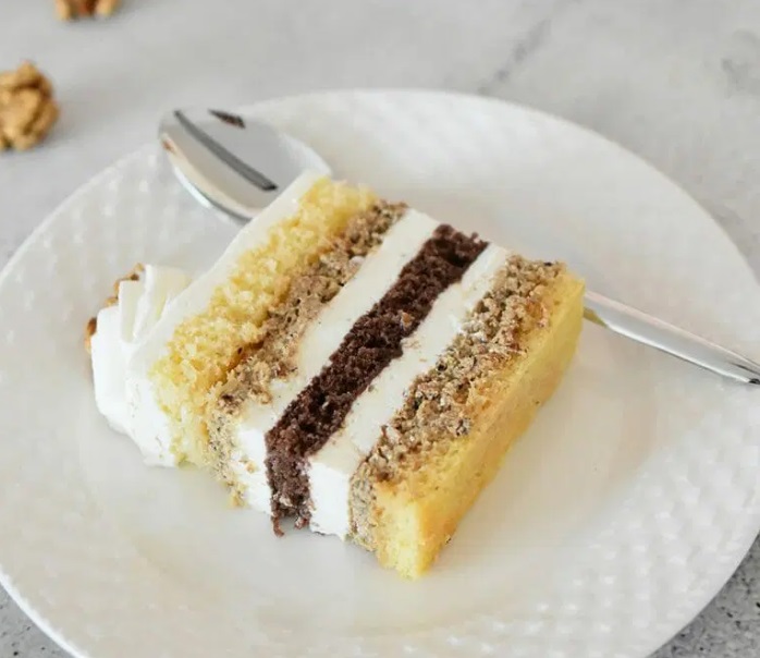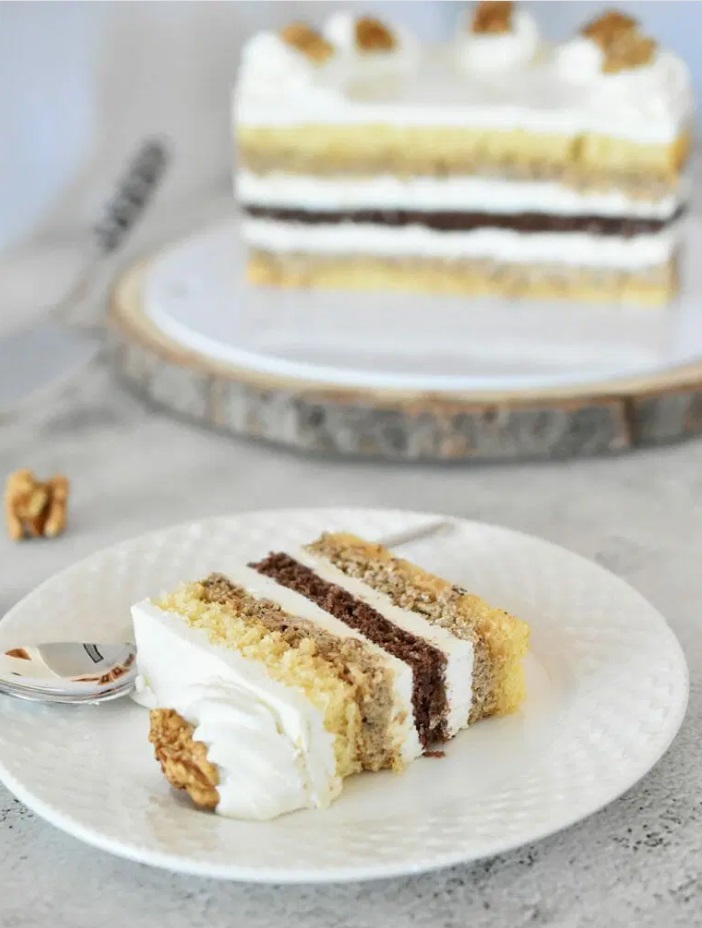 Na orehov nadev položimo drugo plast svetlega biskvita, ga z rokami nežno pritisnemo ob kremo in navlažimo. Premažemo ga z ostankom skutine kreme in torto damo v hladilnik za vsaj 6 ur, najbolje čez noč.