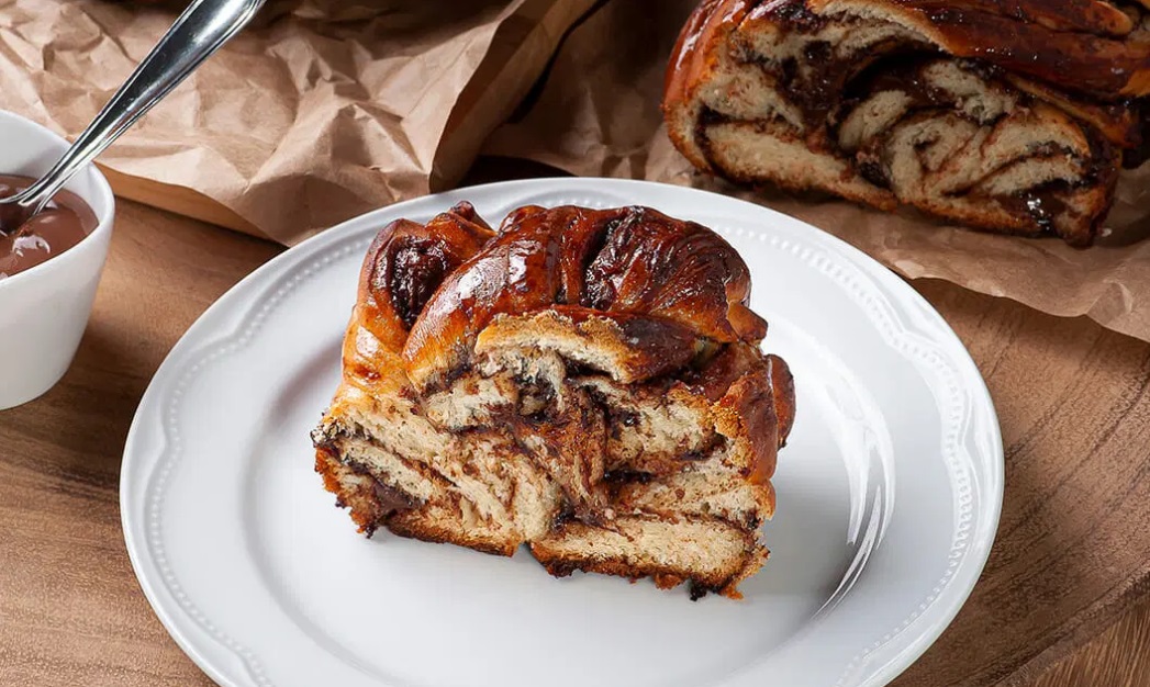 Namazano testo začnemo valjati po daljši strani. Zvito obrnemo na rob, tako, da ne steče čokolada ven. Testo prerežemo po dolžini, na koncu pustimo in prepletemo skupaj oba dela. Prerezan del vsakega traka obrnemo navzgor.