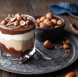 Sladico postavimo v hladilnik za 1 uro. Preden jo postrežemo, jo okrasimo z grobo narezanimi lešniki in čokolado.