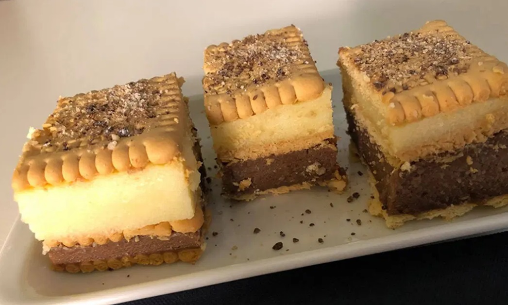 V pekač velikosti 20×30 cm med kuho zdroba položimo plast petit piškotov (cca 5×3 piskote), ki jih ni potrebno nič predhodno močiti. Čeznje takoj prelijemo rjavo maso, poravnamo in položimo drugo plast piškotov (poskusite položiti piškotke v isto smer), preko druge plasti pa prelijemo še belo maso in še eno plast piškotov.