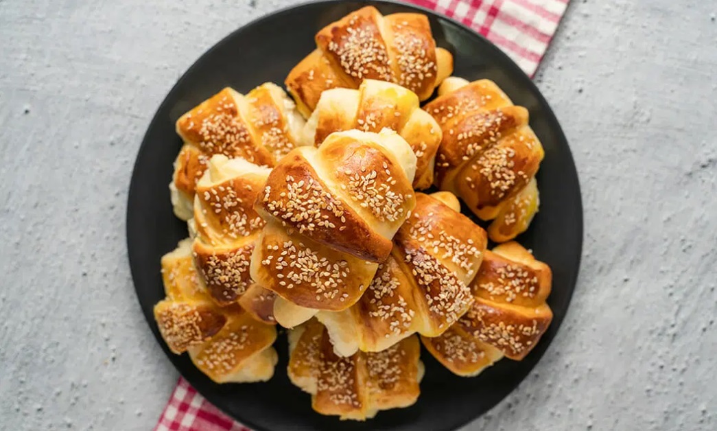 Dobljeno testo razdelimo na šest kroglic, vsako na pomokani površini razvaljamo v krog in razrežimo na osem trikotnikov. Na vsakega od njih damo malo nadeva in ga zvijmo v rolado.