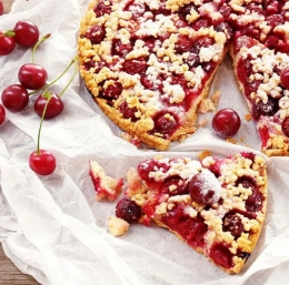 Testo ohladimo, rob pekača dobro namažemo z maslom in s preostalim testom oblikujemo približno 3 cm visok rob. Na pečeno osnovo razporedimo višnje in pripravimo še maslene drobtine. Moko presejemo, dodamo sladkor, vanilijev sladkor in kosmiče masla. Najlažje kar z rokami oblikujemo drobtinice. Te posujemo po višnjah in pito pečemo od 30-40 minut (do zlato rjave barve) na 200 °C.