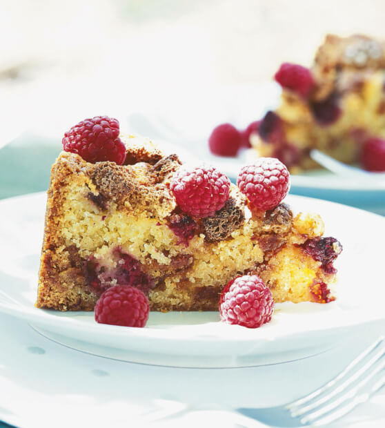 Kolač vzamemo iz hladilnika eno uro prej, preden postrežemo. Lahno ga poprašimo s sladkorjem v prahu in ga ponudimo s preostalimi malinami in sladko smetano.