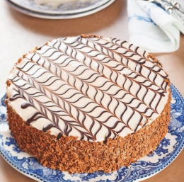 Plast biskvita, ki smo jo premazali z marelično glazuro, oblijemo s sladkornim oblivom. Stopljeno čokolado damo v majhno vrečko za zamrzovanje, ki ji nato odrežemo vogalček, da dobimo majhno luknjico. S čokolado po vrhu torte nabrizgamo vodoravne črte, nato pa pravokotno nanje povlečemo z zobotrebcem, da dobimo mrežo. (Čokolado lahko nabrizgamo tudi v koncentričnih krogih in z zobotrebcem vlečemo črte od sredine proti obodu.)