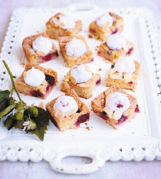 Za oblogo potrebujemo brizgalno vrečko in nastavek z 1 cm veliko odprtino ali pa vrečko za zamrzovanje, ki ji odrežemo vogal. Beljaka stepemo z limonovim sokom in ščepom soli, da nastane sneg z mehkimi vršički. Postopoma dodajamo 100 g sladkorja – po 1 žlico naenkrat, pri čemer vsakokrat dobro stepemo, da dobimo čvrsto in bleščečo meringo. Nanjo nakapljamo robidovo omako in pomešamo samo toliko, da so v masi vijoličasti madeži. Meringo nadevamo v vrečko in na pecivo v enakomernih razmakih nabrizgamo 16 vetrcev velikosti oreha (nekaj meringe bo ostalo), posujemo s popraženimi mandljevimi lističi in pečemo še 10 do 12 minut, da se vetrci strdijo. Kolač naj se 30 minut ohlaja v modlu, nato ga preložimo na kuhinjsko mrežico in pustimo, da se popolnoma ohladi. Po želji ga poprašimo s sladkorjem v prahu in narežemo na kocke.