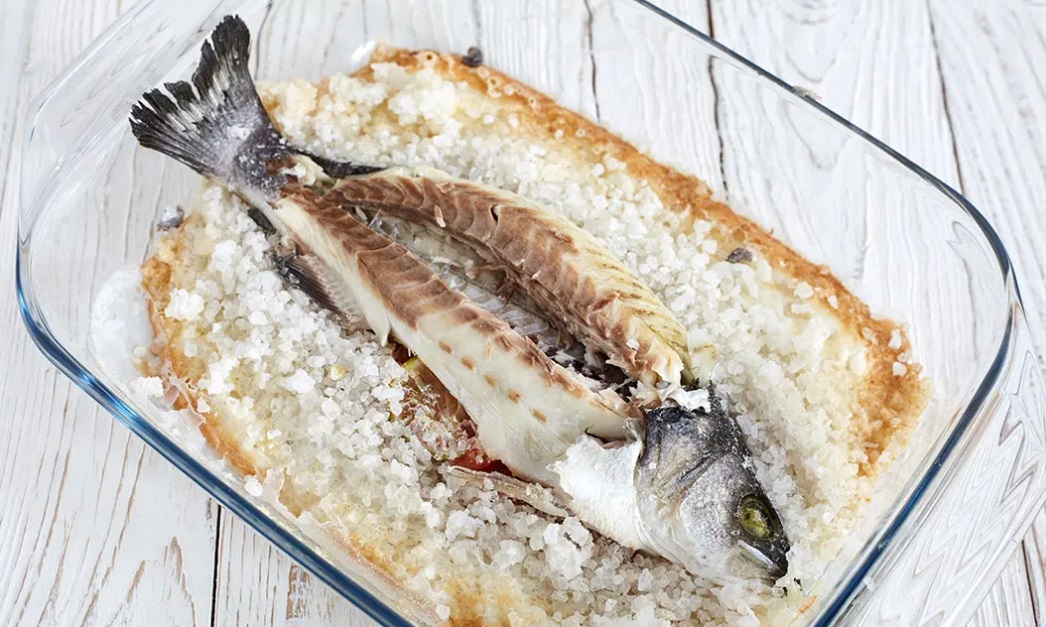 Pečemo 35 minut. Slano skorjo previdno razlomimo in zavržemo. Brancinu olupimo kožo in postrežemo.