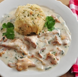 Lisičke dušimo še 5-10 minut, da se nam omaka malo zgosti, nato potresemo s svežim peteršiljem ali koprom in postrežemo s kruhovim cmokom ali pire krompirjem.
