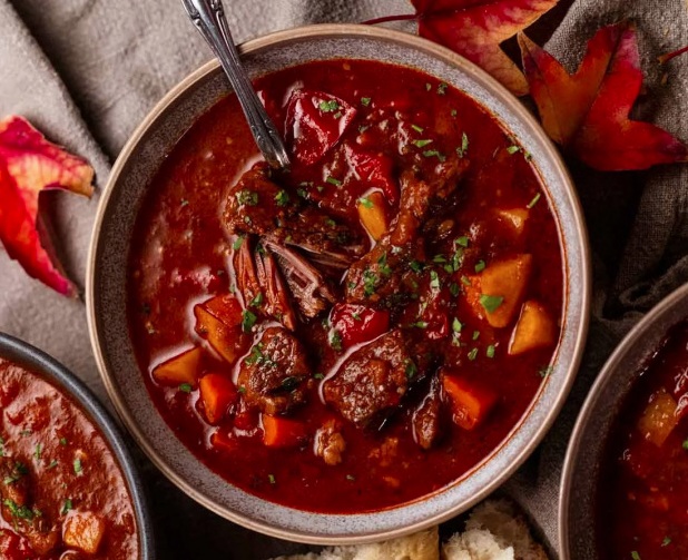Je pikanten, vendar ne peče! Pripravite ga lahko iz cenejših kosov govedine in še vedno bodo na koncu zelo mehke. Če nastane pregost, preprosto dodajte malo vode. Okrasite s kislo smetano.