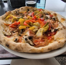100 g paradižnikove omake (po možnosti domače), 100 g pršuta, 50 g svežih gob (šampinjoni ali mešane gozdne gobe), 50 g vloženih artičok, 1 majhna rumena paprika (narezana na trakove), 50 g mocarele (ali mešanica mocarele in drugega sira po izbiri), sveža bazilika za okrasitev, malo origana in oljčnega olja za dodaten okus.