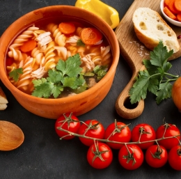 V hladnih dneh je piščančja juha z dodatkom testenin odlična izbira, saj nas prijetno pogreje in nasiti. Ta preprost recept je kot nalašč za tiste, ki cenijo okus domače juhe in si želijo hitro pripraviti hranljiv obrok. Juha na fotografiji vsebuje sestavine, kot so piščančje meso, korenje, čebula, češnjev paradižnik in fusilli testenine. Priprava je enostavna, končni rezultat pa bo navdušil vaše brbončice.
