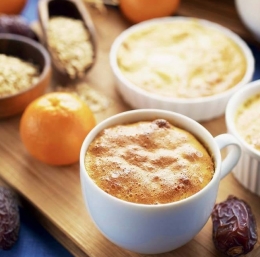100 g masla 125 g medu 3 rumenjaki 6 žlic mleka 2 žlici vinjaka ali ruma 80 g pirine moke 50 g ovsenih kosmičev 100 g mandarin (krhlji iz pločevinke) 100 g dateljnov (olupljenih, brez koščic, narezanih na koščke) 3 beljaki maslo za modelčke