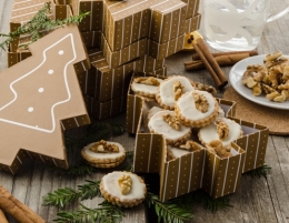 Na pomokani delovni površini razvaljamo krhko testo ter z modelčkom izrežemo piškote in jih položimo na pekač. Piškote pečemo ca. 12 minut in pustimo, da se ohladijo.